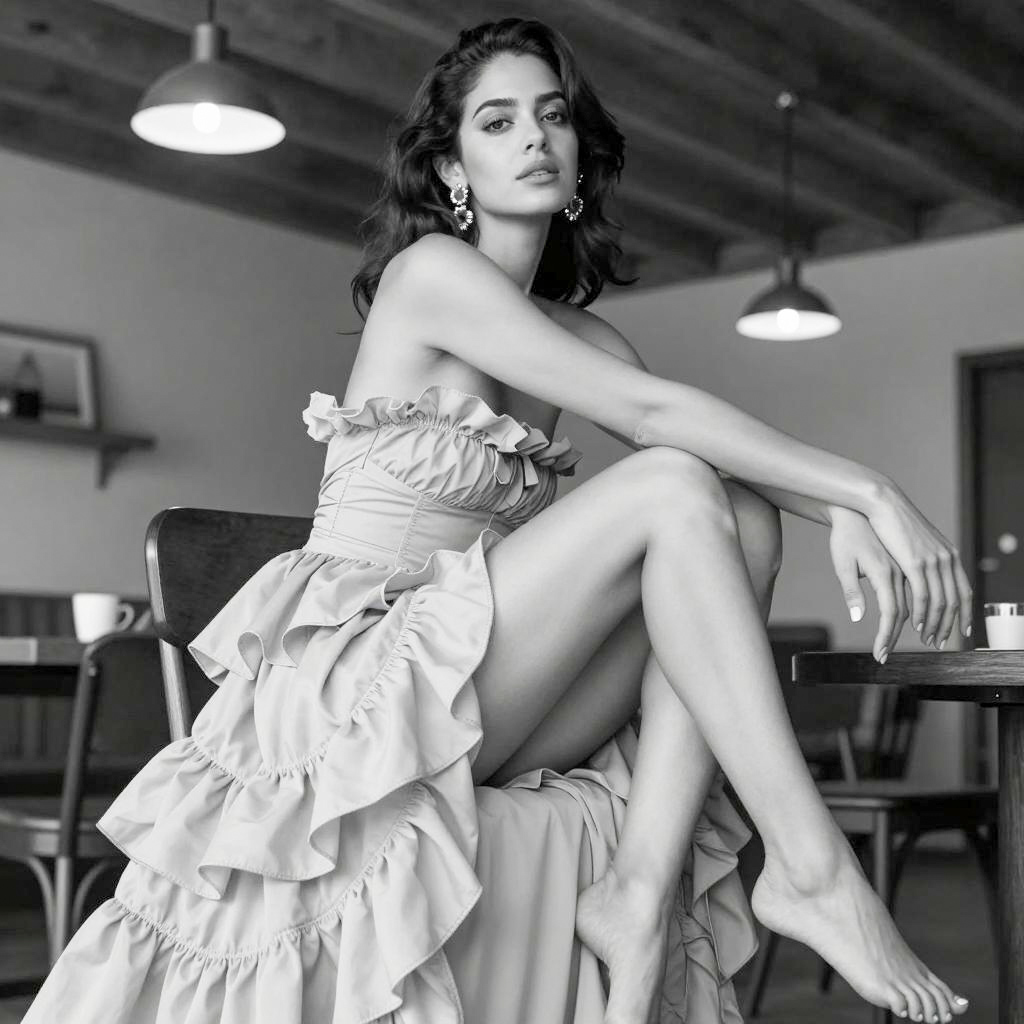 A woman with dark brown hair styled in a bun wearing a white off-shoulder dress with black polka dots. She is accessorized with multiple pearl necklaces and black heeled shoes. The woman leans against a stone balustrade with an intense facial expression. The background shows a peach-colored building and green foliage, photographed in daylight.