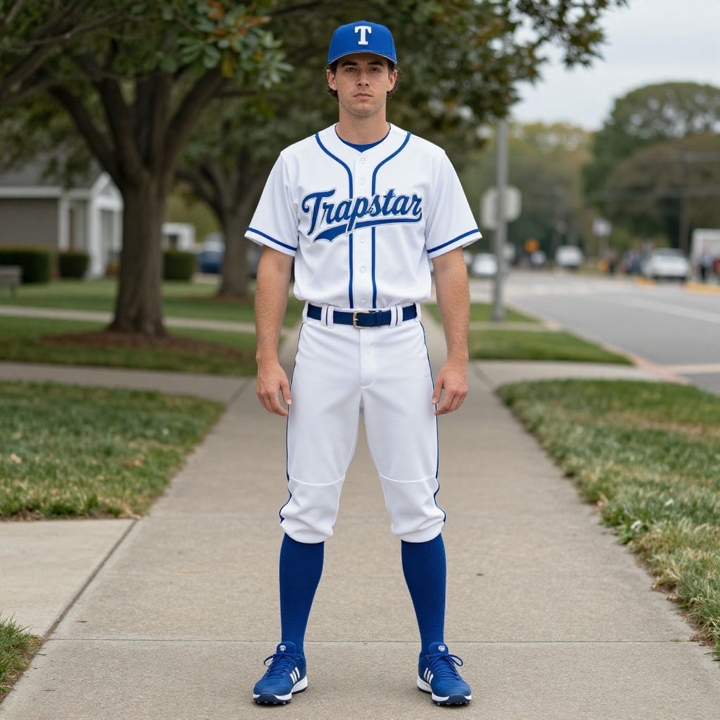 Trapstar Shirt Costume, man in a baseball uniform standing on a sidewalk