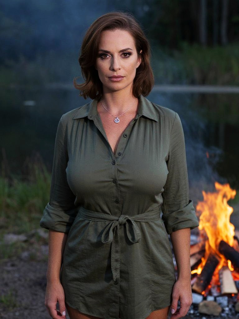 Photograph of a woman standing outdoors in front of a campfire. She has shoulder-length brown hair, light skin, and is wearing an olive-green, button-up, belted dress that accentuates her large breasts. She has a serious expression and is looking directly at the camera. A silver necklace with a small pendant is visible around her neck. The background is dark with blurred trees and a faint blue light, contrasting with the bright orange flames of the campfire behind her. The image has a realistic style.