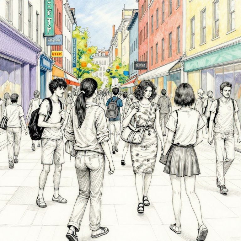 Intricate line drawing of a lively city street filled with diverse individuals walking and interacting. The image features detailed expressions and dynamic poses against a vibrant urban backdrop with colorful buildings, trees, and shop signs. The style is impressionistic with soft colors and fine line work, capturing the busy, social atmosphere of an urban environment.