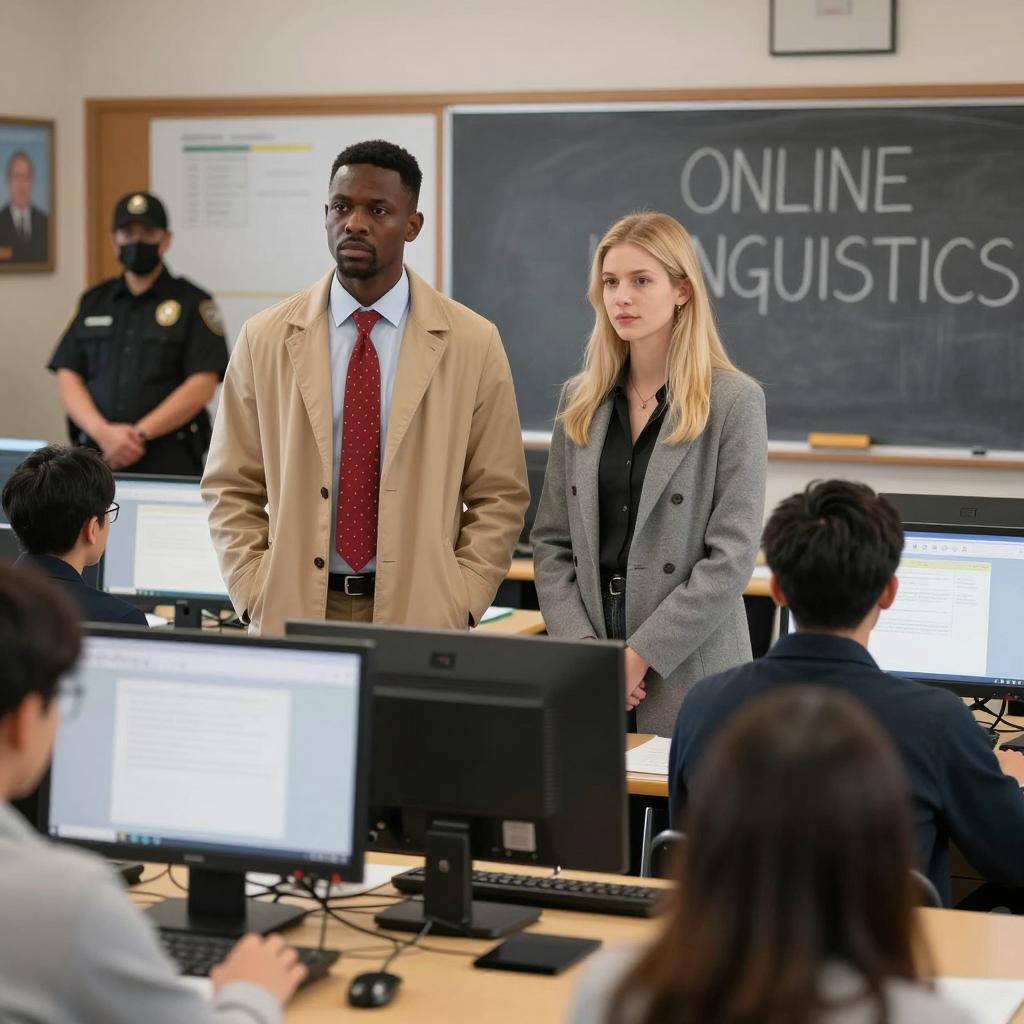 A classroom. African-American man in beige coat and red polka dot tie stands front left, looking serious. Blonde woman in gray coat stands beside him. Students with computers in foreground. Chalkboard in background reads "ONLINE LINGUISTICS." Computer monitor on desk labeled "14." Wooden walls, framed pictures. Person in black security uniform stands in background.