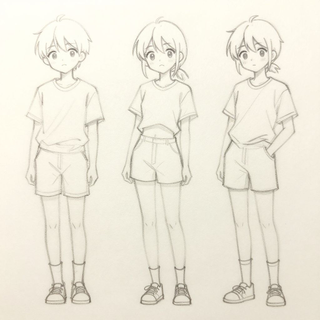 This is a digital pencil sketch of three identical young characters standing side by side. Each character has short, messy hair and large, expressive eyes. They wear simple t-shirts and shorts, with socks and sneakers. The character on the left stands with a neutral posture, arms by their sides. The middle character has a slightly forward lean with hands loosely at their sides, while the right character stands with one hand in their pocket and a more relaxed stance. The sketch is minimalistic, with clean lines and no shading, focusing on the characters' outlines and basic clothing details.