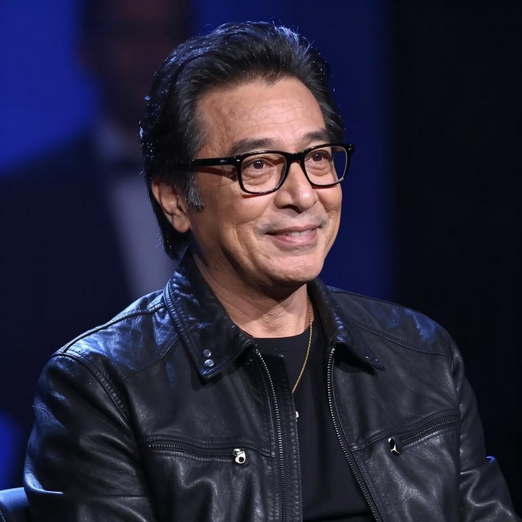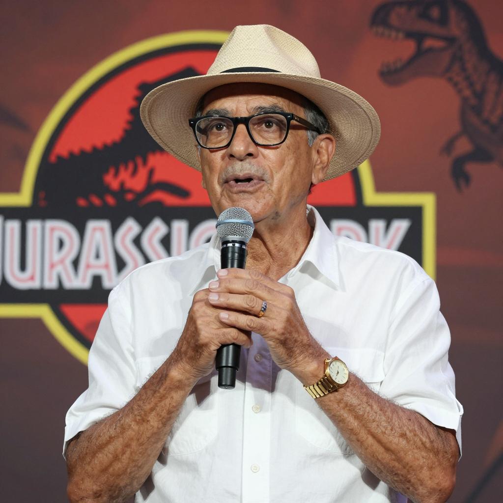 Middle-aged man with glasses, light skin, and a straw hat speaking into a microphone. He wears a white short-sleeved shirt and a gold wristwatch. He stands in front of a large, ured, red-brown background with a detailed dinosaur and the "JURASSIC PARK." He holds the microphone close to his mouth, slightly to the right. He has a focused expression. The background is slightly out of focus compared to the man.