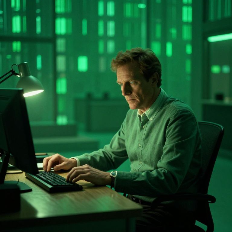 Photograph of a middle-aged man with short brown hair, wearing a green button-down shirt, sitting at a wooden desk in a dimly lit office at night. He is focused on a computer keyboard, typing under the glow of a green-shaded desk lamp. The background features large, illuminated office windows, casting a greenish hue over the scene. The man's expression is concentrated, and he wears a silver wristwatch on his left wrist. The overall mood is introspective and tech-focused, with a strong green light accentuating the atmosphere.
