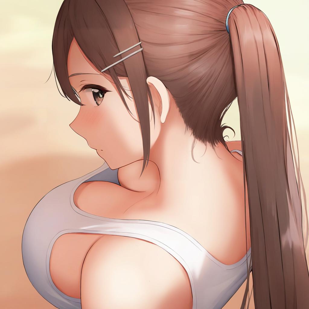 1girl, long straight hair, brown eyes, red, hair ornament, ponytail, hairclip, beach, large breasts, downblouse from behind, downblouse, from behind, tank top , white tank top, cleavage, from above, nape, head down, looking at viewer, looking back, looking up, sideways glance