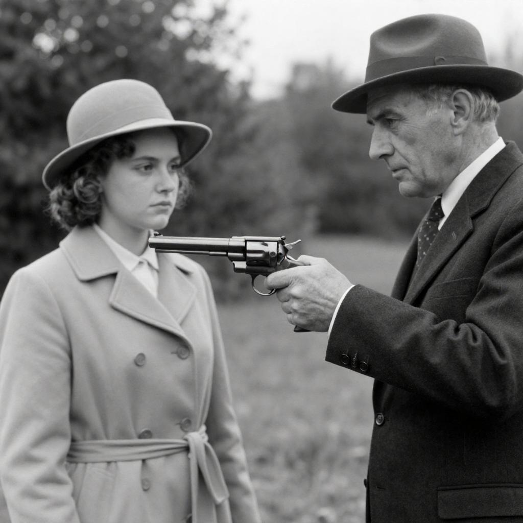 Black-and-white photograph of an older man in a dark suit and hat instructing a young woman in a light coat and hat to hold a vintage revolver. Background includes trees and foliage. Man's face shows intensity, woman's face is neutral. Man's hand guides the woman's hand holding the gun. Outdoor setting.