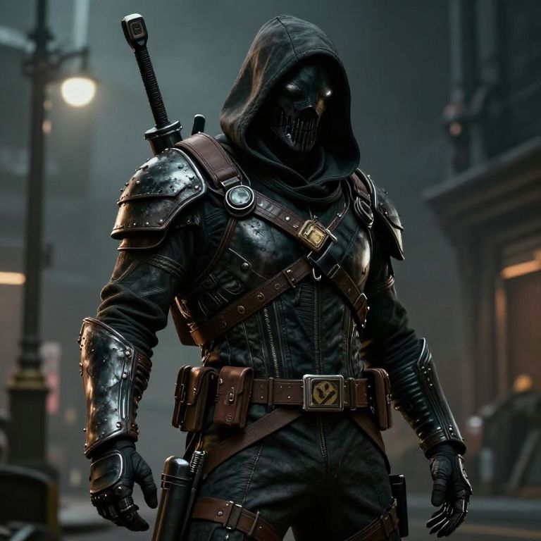 A digital CGI image of a hooded, masked figure in dark, reflective armor with metallic shoulder plates and gauntlets. The figure's face is obscured by a black mask with glowing eyes. A sword is sheathed on their back. They wear a brown leather belt with a large buckle and pouches. The background is a dimly lit, foggy urban street with blurred streetlights and buildings. The figure's stance is strong and imposing, with a slight forward lean. The color palette is predominantly dark with metallic highlights, creating a mysterious and ominous atmosphere.