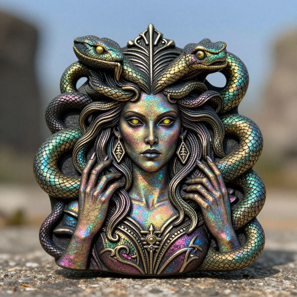 A photograph of an intricately crafted, metallic sculpture of a woman with serpent-like hair. The woman's face is serene with glowing yellow eyes, and her hands are delicately touching her hair. The hair, covered in scales, is entwined with multiple snakes, each with iridescent, rainbow-colored scales. The sculpture's surface has a shimmering, holographic effect. The background is blurred, featuring a sandy, outdoor setting with indistinct shapes, suggesting a natural environment. The woman wears an ornate, decorative chest piece, adding to the mythological and mystical aura of the artwork.