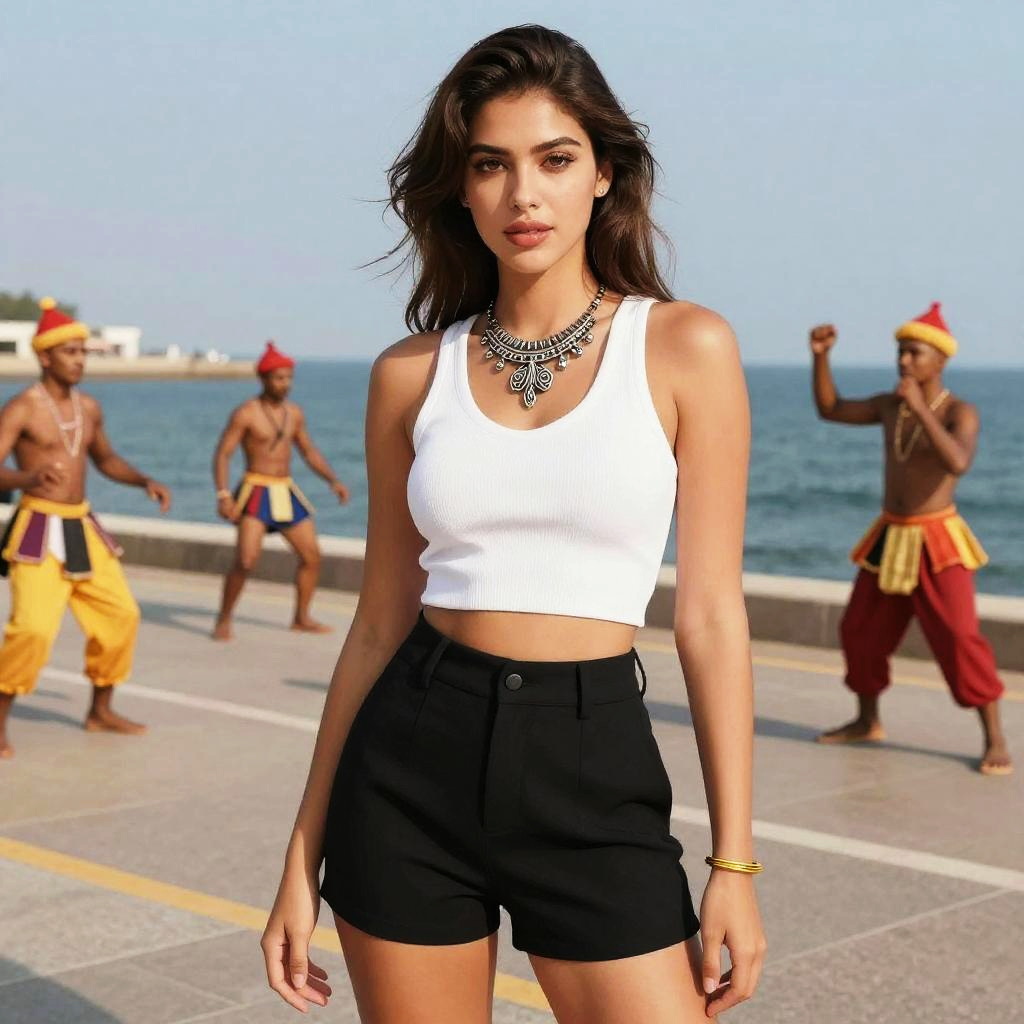 Photograph of a young woman with medium tan skin and dark wavy hair, standing on a concrete waterfront path. She wears a white cropped tank top, black high-waisted shorts, and a statement necklace. Her expression is confident, with a slight smile. In the background, four shirtless men with various colorful turbans and traditional Indian attire, including yellow and red pants, perform a dance. The blue ocean and clear sky are visible behind them. The woman's wrist has a gold bracelet, and the overall scene has bright daylight. The image has a slightly stylized, digital art-like quality.