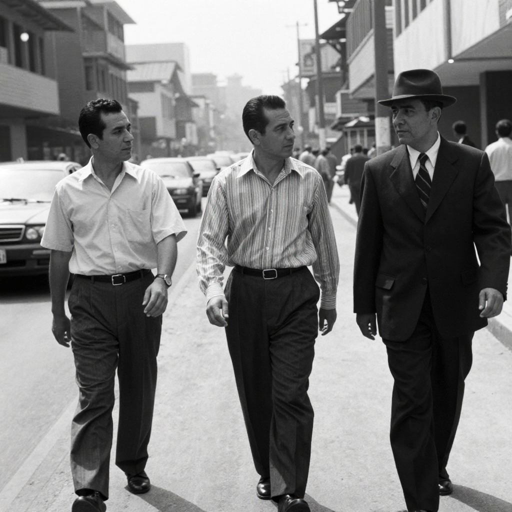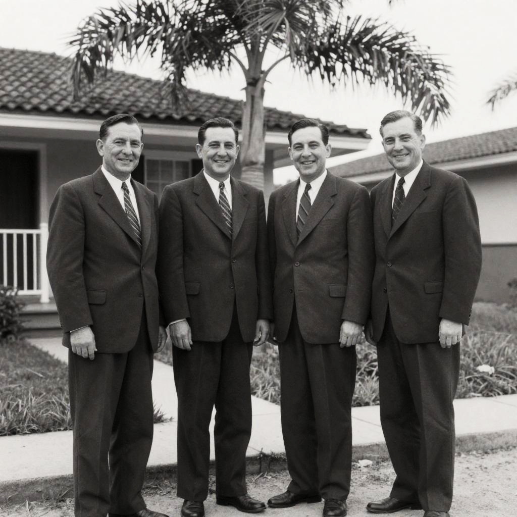 This is a black-and-white photograph of four men standing outdoors, wearing dark suits and ties. They're standing close together, smiling at the camera. Behind them is a house with a roof and a large palm tree. The ground is a mix of grass and dirt. The image has a slightly grainy texture and a nostalgic feel.