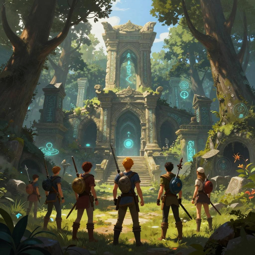 Fantasy art dnd scene depicting a mystical forest with ancient ruins, glowing magical runes, and a group of adventurers preparing for a quest, vibrant colors and detailed textures, epic fantasy style, dynamic lighting