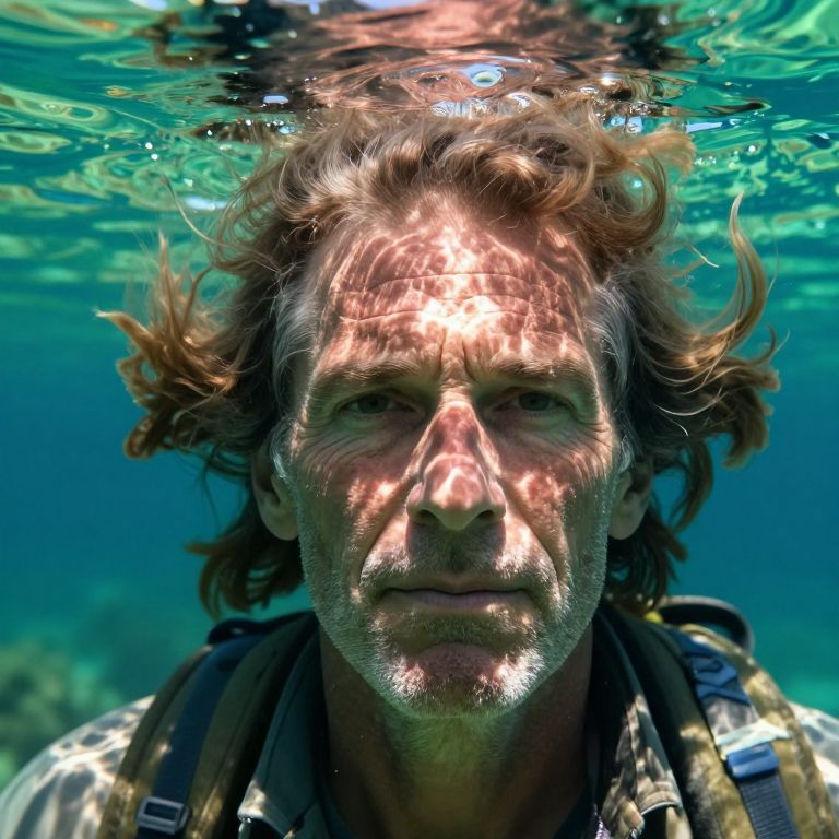 A portrait photograph encapsulates an experienced adventurer's essence with sun-kissed features; their intense gaze reveals a lifetime of adventures. From an unconventional underwater perspective, we see their wrinkled face framed by flowing locks dancing in the current, evoking tranquility and anticipation. The background artfully blends nature's elements with abstract shapes and colors, suggesting a serene yet mysterious underwater realm where light filters through layers of translucent green and blue, enveloping the subject in ethereal beauty.