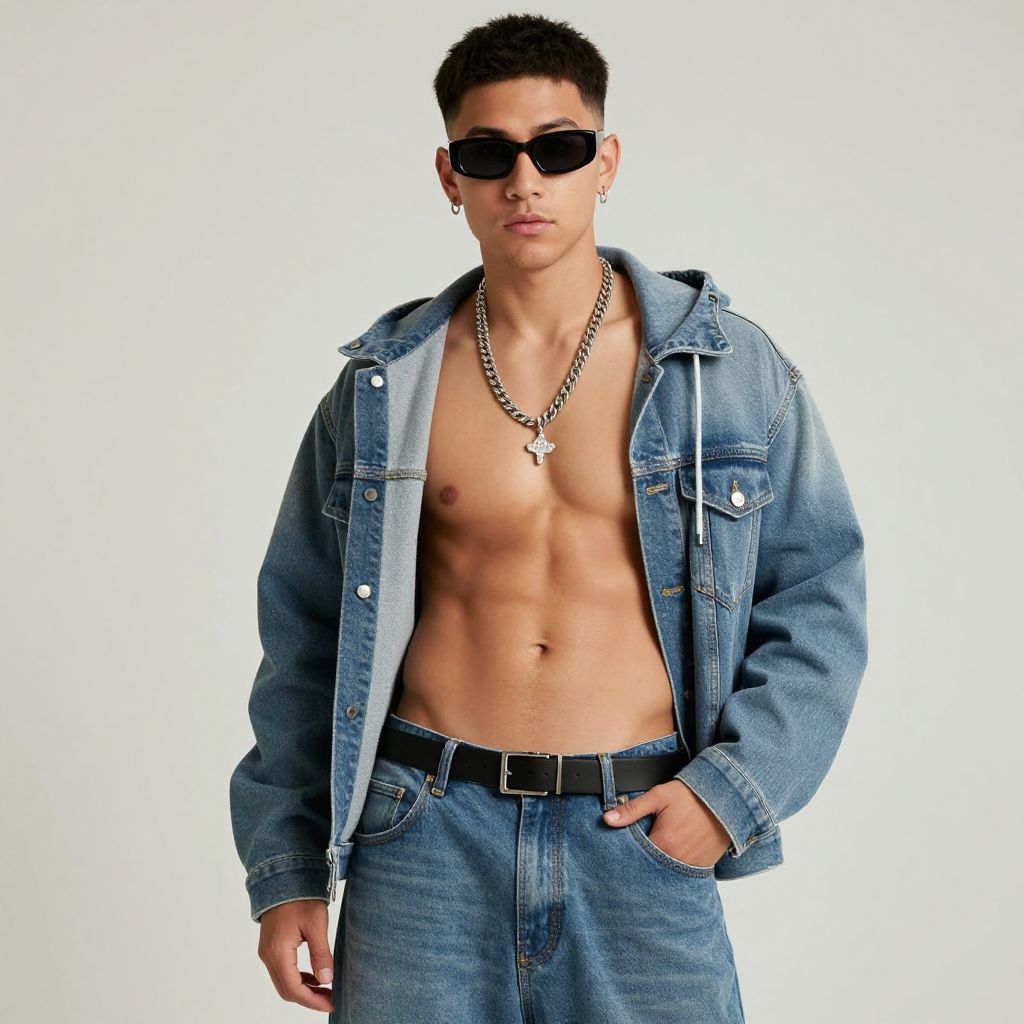Photograph of a young Asian man with short black hair, wearing black sunglasses, a silver chain necklace with a pendant, and a blue denim jacket left open to reveal a toned, muscular chest and abdomen. He has his hands in his pockets and wears matching blue denim pants with a black belt. The background is plain white, making him the focal point. He exudes a confident, stylish vibe. His skin tone is light, and he has a slight stubble on his face. The image has a clean, modern, and slightly edgy look.