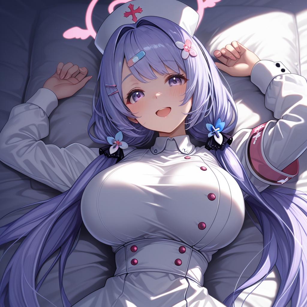 Hanae (blue archive), blue archive, 1girl, skin fang, blue eyes, purple hair, very long hair, long hair, bandaid hair ornament, twintails, hairclip, large breasts, nurse cap, halo, pink halo, long sleeves, by artist untue, dark_illustrious