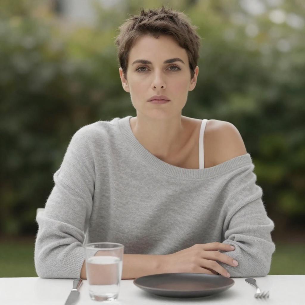 Photograph of a fair-skinned woman with short brown hair and a serious expression, wearing a gray off-shoulder sweater revealing a white strap. She is sitting at a white table outdoors with a glass of clear liquid and an empty black plate in front of her. The background features a blurred green sunlit garden.