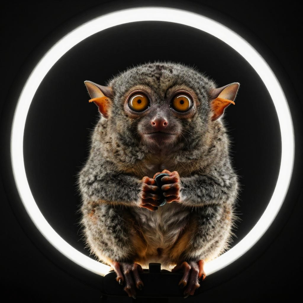A cute tarsier, chubby and fluffy, grey, overhead and ring lights, Hyper-realistic photograph, shot with Hasselblad X1D, uhd image, 8k resolution, in the style of elke vogelsang, humorous caricature, in the style of Elliott Erwitt, isolated
