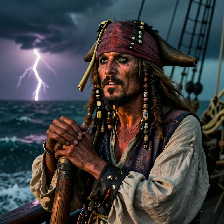 Imagine a compelling portrait photograph of an experienced pirate captain. His weathered, gnarled face is marked by years spent at sea, with the sun's final rays bathing his rugged features in a warm glow. The light accentuates the creases around his eyes and mouth, reflecting a lifetime of laughter and adventure. Leaning against the ship's railing, he gazes pensively towards the horizon, his hands tightly gripping the worn wooden post. The scene shifts to reveal a stormy sea illuminated by lightning flashes, providing an awe-inspiring backdrop. The interplay of light and shadow on his face creates an emotional spectrum, conveying both resilience and vulnerability. This introspective moment draws viewers into the storied mariner's world as he navigates the turbulent seascape before him.