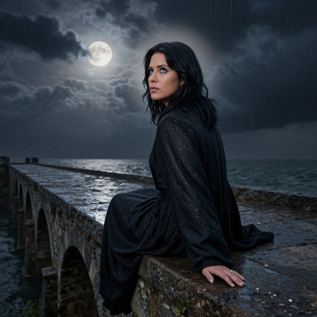 Photograph of a pale-skinned woman with dark, wavy hair and striking blue eyes, sitting on a wet, stone pier under a moonlit, rainy night sky. She wears a black, long-sleeved, slightly translucent dress that clings to her body, accentuating her slender frame. The full moon shines brightly through partly cloudy skies, casting a silver glow on the dark, choppy water below. The pier's textured stone surface is slick with rain, reflecting the moonlight. The woman gazes over her shoulder with a somber expression, her left hand resting on the pier while her right hand supports her weight.