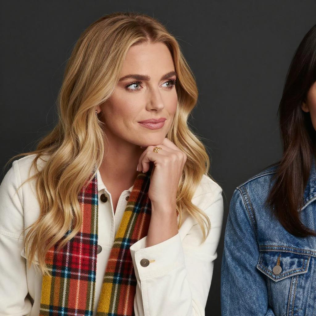 Photograph of two women against a dark background. The woman on the left has long, wavy blonde hair, light skin, and wears a white jacket with a colorful plaid scarf. She looks to the right with a slight smile. The woman on the right, partially visible, has dark brown hair and wears a blue denim jacket. The blonde woman's hand rests on her chin.