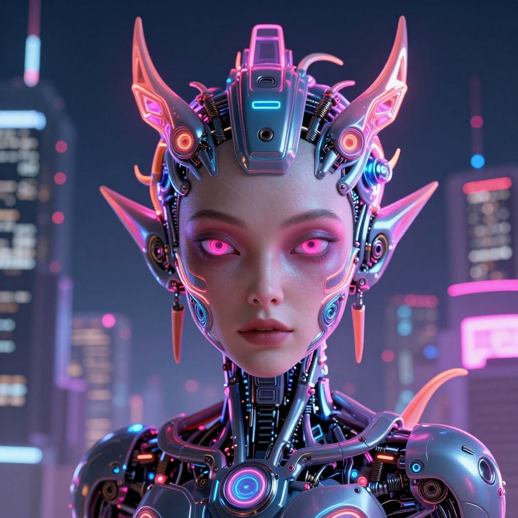 Frotal, a surreal futuristic creature blending frontal human features with neon cybernetic elements, surrounded by glowing cityscape at night, hyperrealistic textures, vivid colors, intricate details, cinematic lighting --v 5 --ar 16:9