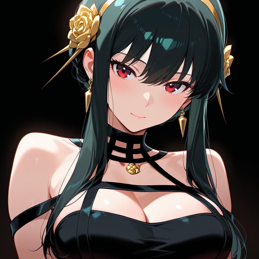 Yor briar, 1girl, bare shoulders, black dress, black hair, breasts, closed mouth, dress, earrings, flower, hair flower, hair ornament, hairband, jewelry, medium breasts, long hair, looking at viewer, red eyes, sidelocks, sleeveless, solo, upper body, black background