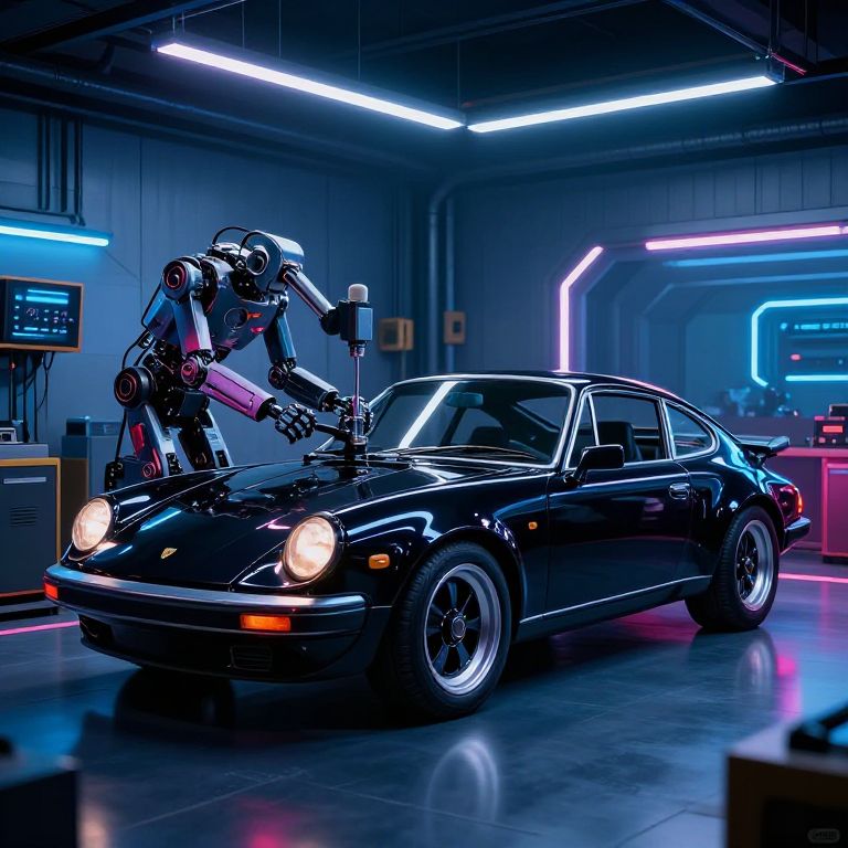 Porsha 944 in a high-tech futuristic garage illuminated by neon lights, glossy black finish with glowing accents, robot mechanics working on the engine, reflective surfaces, cyberpunk style blending classic car design with modern technology.