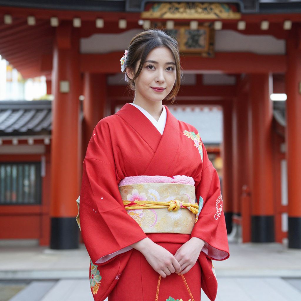 Photograph of a young Asian woman in a red kimono with gold obi, white hairpins, standing in front of a traditional Japanese red wooden