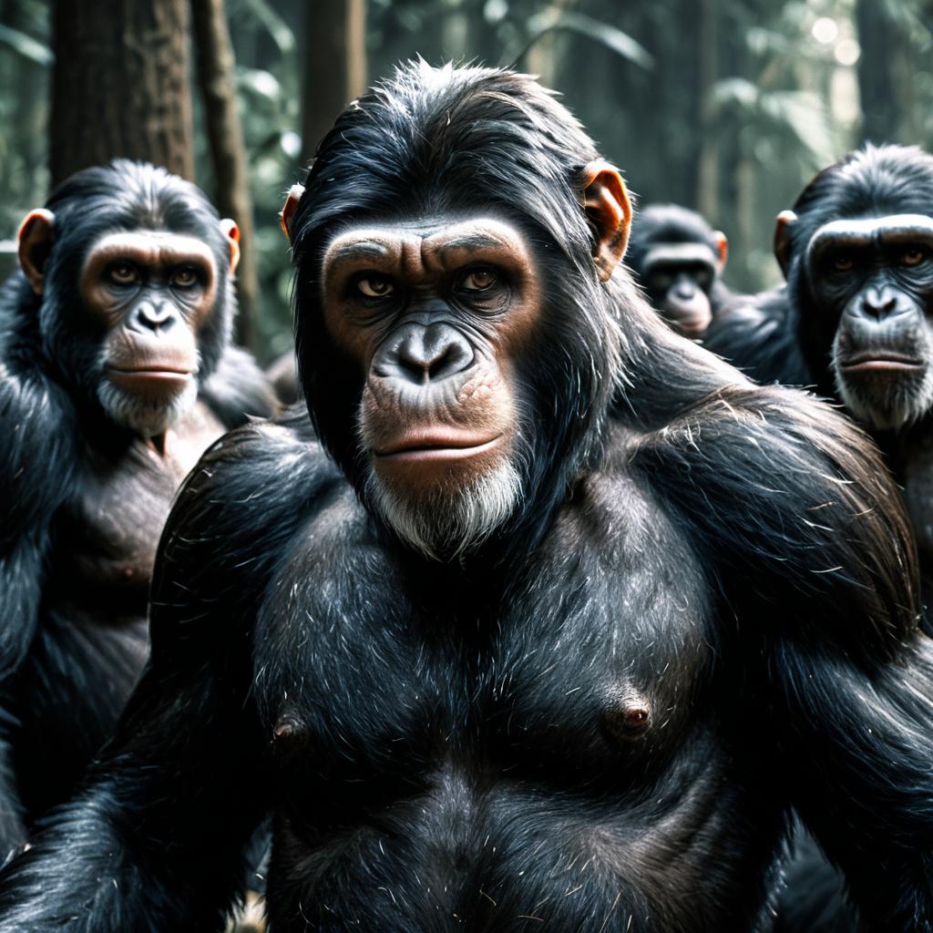 Close-up view of a group of realistic apes with detailed facial features and dark fur, standing in a dense forest environment. The apes display serious expressions, with highlights emphasizing their textured fur and muscular build.