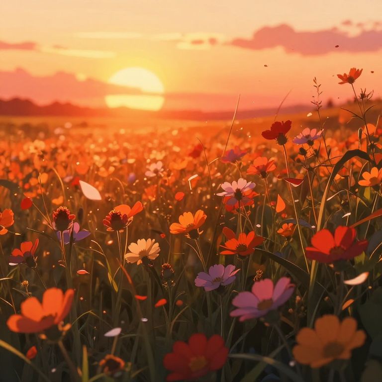 Anime flower drawing illustrating a vibrant field of wildflowers under a golden sunset, dynamic composition with movement in the petals, warm orange and red hues contrasting with cool shadows, detailed anime-style textures enhancing the natural beauty and tranquility