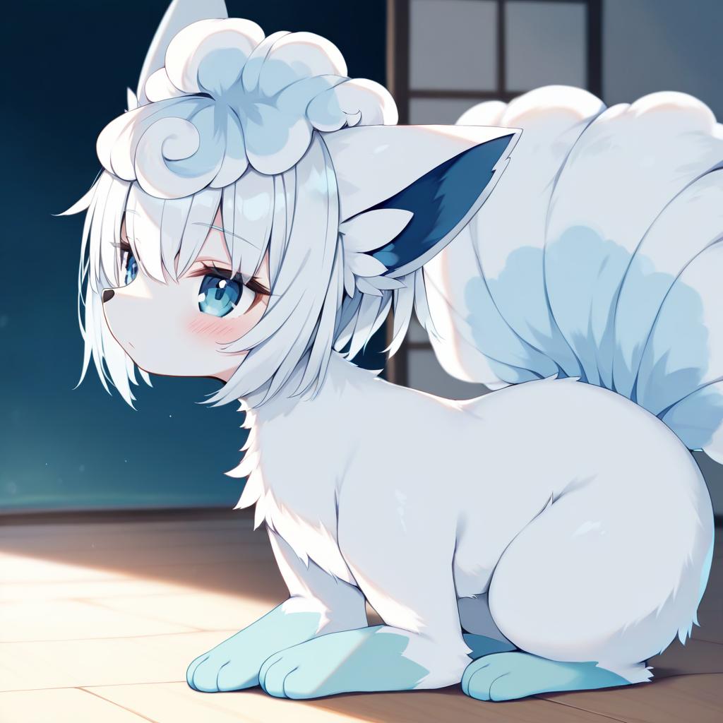 Alolan vulpix, pokemon, no humans, fox ears, fox tail, blue eyes, short hair, white hair, pokemon (creature), white fur, two-tone fur, body fur, by artist nibiiro shizuka, illustrious