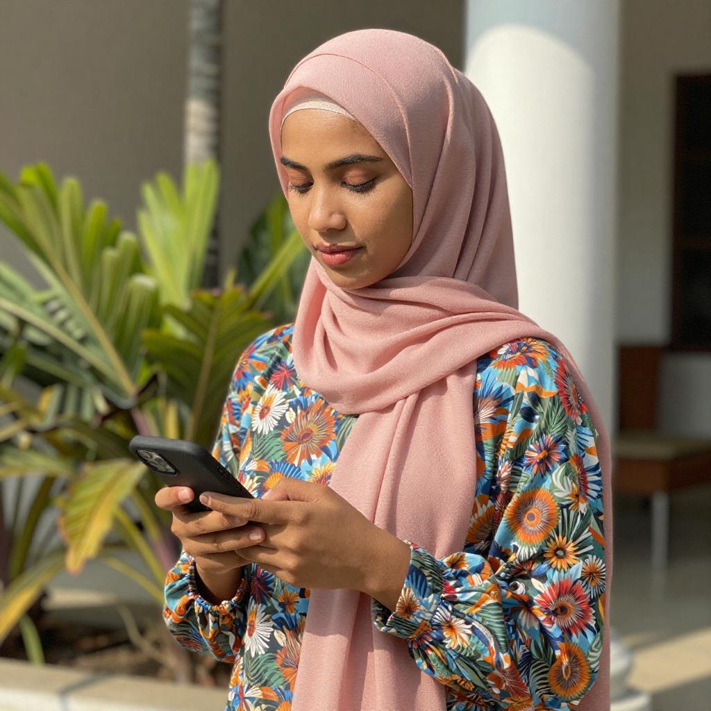 Photograph of a young woman with medium brown skin and black hair, wearing a yellow top, black cardigan, and blue jeans, sitting on a pink couch with her legs crossed. She has black sunglasses on her head and holds a smartphone in her right hand. Green bamboo plants are in the background.