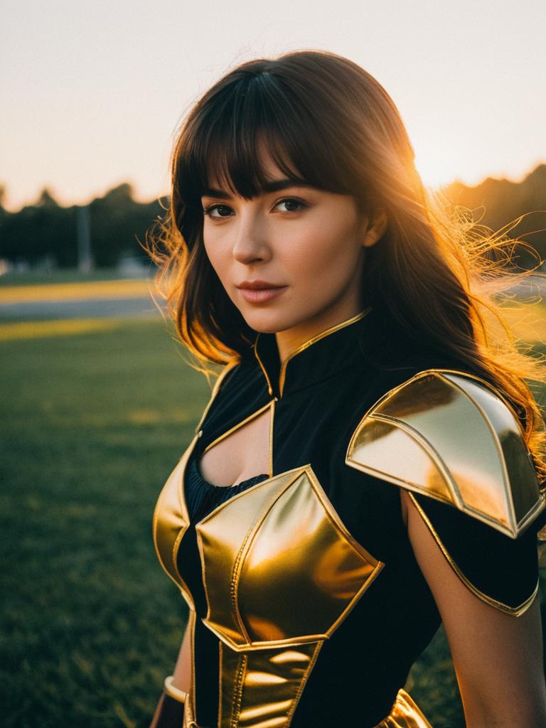 Portrait of a young woman wearing a golden armor costume with a red cape, standing outdoors during the golden hour. The costume includes metallic chestplate and shoulder guards with intricate design, complemented by brown hair and natural makeup. The sunlight creates a warm and dramatic effect, highlighting the details of the armor.