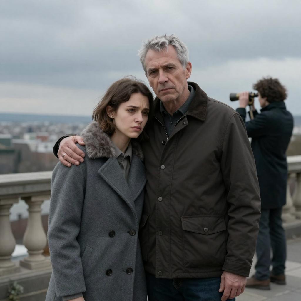 A touching photograph of an older man dressed in a gray military uniform with green epaulettes hugging a young woman wearing a maroon coat. Both have their eyes closed, sharing a warm, intimate moment. They stand in front of a staircase with metal railings in the background.