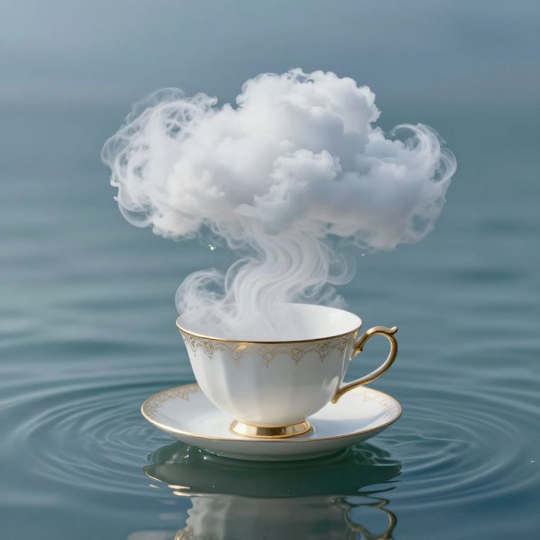 A delicate teacup, adorned with golden accents, floats serenely on a tranquil water surface, its brim overflowing with billowing clouds that dance and swirl like an ethereal storm, defying gravity and merging the realms of sky and sea.