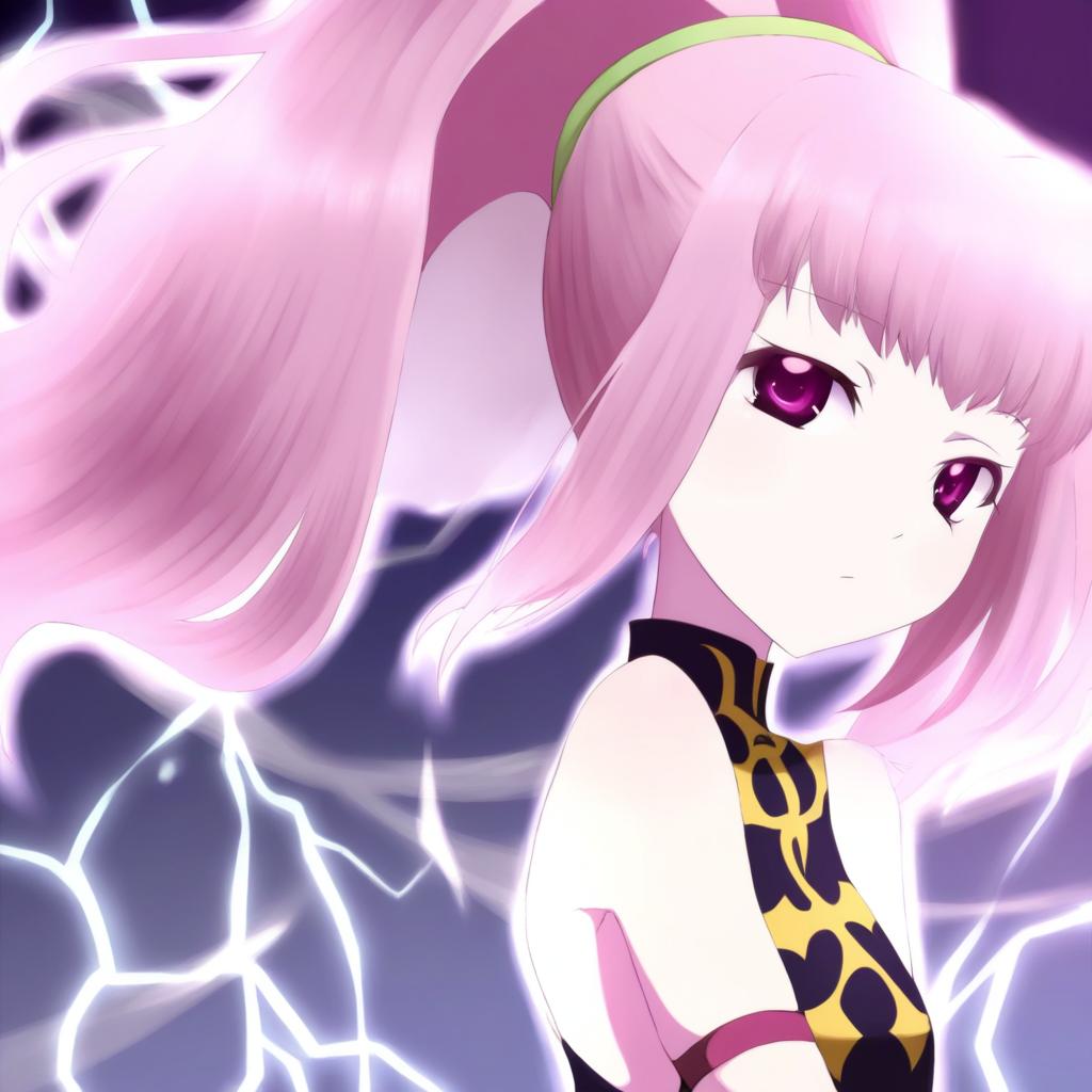 Digital illustration of an anime girl with long pink hair tied with a green band, pinkish-red eyes, and pale skin. She wears a black and yellow futuristic Knights of the Round uniform. The background features bright, white lightning bolts creating a dramatic effect.