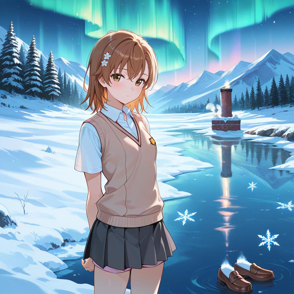 Masterpiece, best quality, misaka mikoto, (cowboy shot:1.2), 1girl, solo, Snowy, Mountains, Majestic, Peaks, Frosty, Silence, Tranquility, Icy, Crystals, Frozen, Pristine, Evergreen, Pines, Enchanting, Serene, Snowflakes, Cascading, Slopes, Winter, Wonderland, Serenity, Solitude, Crisp, Pure, Aurora, Borealis, Alpine, Refuge, Blanketed, Quiet, Reflections, Chimney, Smoke, Cozy, school uniform, tokiwadai school uniform, shirt, white shirt, sweater vest, skirt, v-neck, pleated skirt, short sleeves, brown sweater vest, dress shirt, shorts, grey skirt, socks, collared shirt, shoes, loose socks, shorts under skirt, loafers, brown footwear, black skirt, short shorts, close-up, looking at viewer, sleepy, small breasts, huge_filesize, arms behind back, two_hands_behind_back