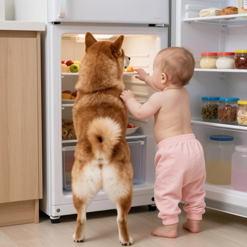 Shiba Inu dog standing on hind legs, facing open refrigerator, next to naked baby in pink pants. Dog has light brown and white fur, baby has light skin and short hair. Baby reaching inside, dog with head inside fridge. Wooden cabinet on left, fridge shelves with various items on right.