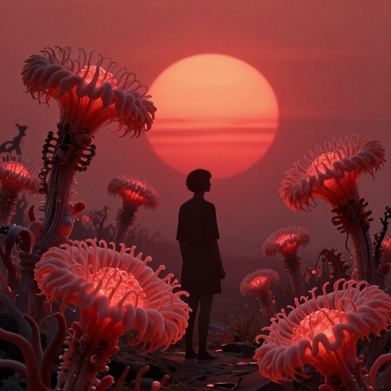 Under a crimson sun, organic machines bloom like giant sea anemones, their rhythmic pulses resonating with the music of the soul, weaving a tapestry of wonder and introspection.
