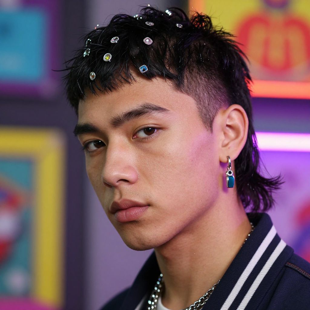 Lightskin mullet hairstyle on a trendy young man, vibrant urban background, neon colors reflecting off metallic accessories, detailed face with confident expression, high fashion magazine style, cinematic lighting, sharp focus.