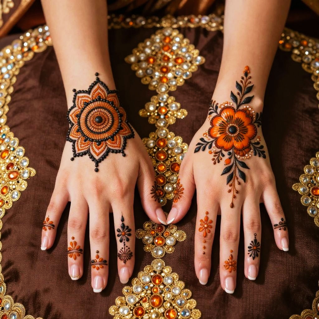 A close-up photograph of two hands adorned with intricate orange and black henna designs. The left hand features a large, detailed mandala pattern on the back, while the right hand has a more elaborate floral design. Both hands rest on a rich, brown fabric with gold embroidery and a bed of orange and silver gemstones. The nails are neatly trimmed and polished.