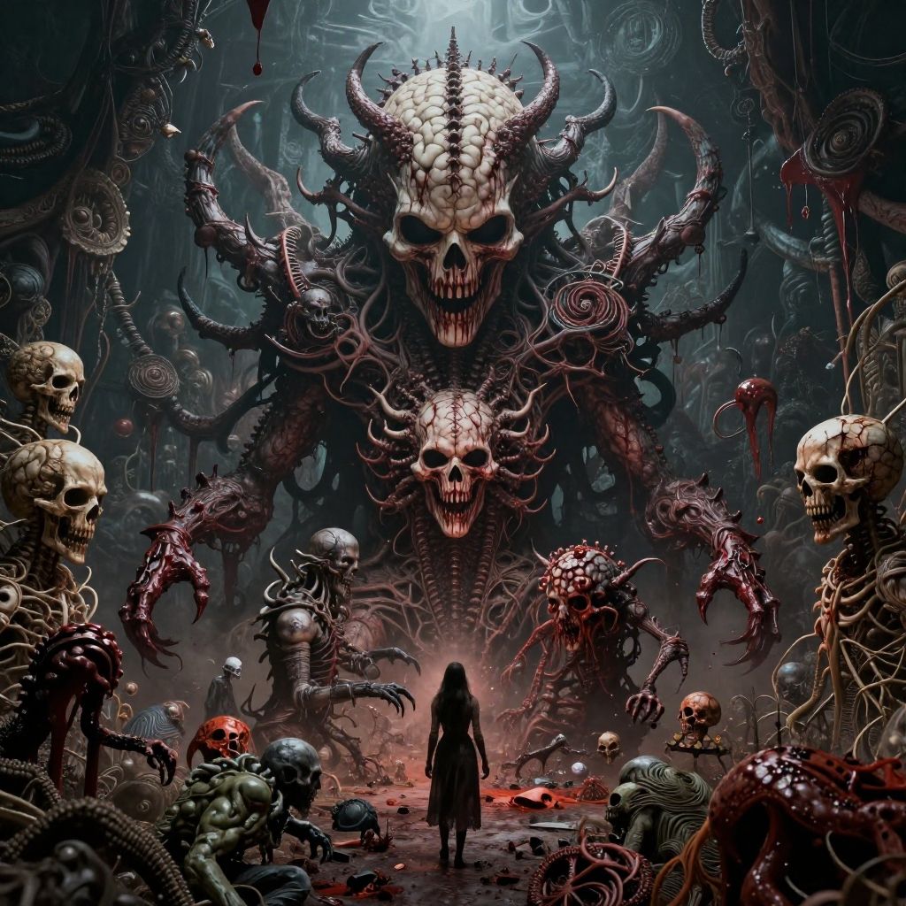 An (extremely detailed:1.0), (Overwhelmingly elaborate, intense chaos:1.2). Vast, insane, landscape of (incredible, chaotic absurdity:1.0). death gore cult macabre, murder horror. elaborate captivating visuals, (hyper-realistic:1.0) demonology. intricately and (insanely strange:1.2), chaotic brain drug culture, psychedelic perfections. Genetic engineering. Hyper-detailed Photography. Cult of thee infinite mind