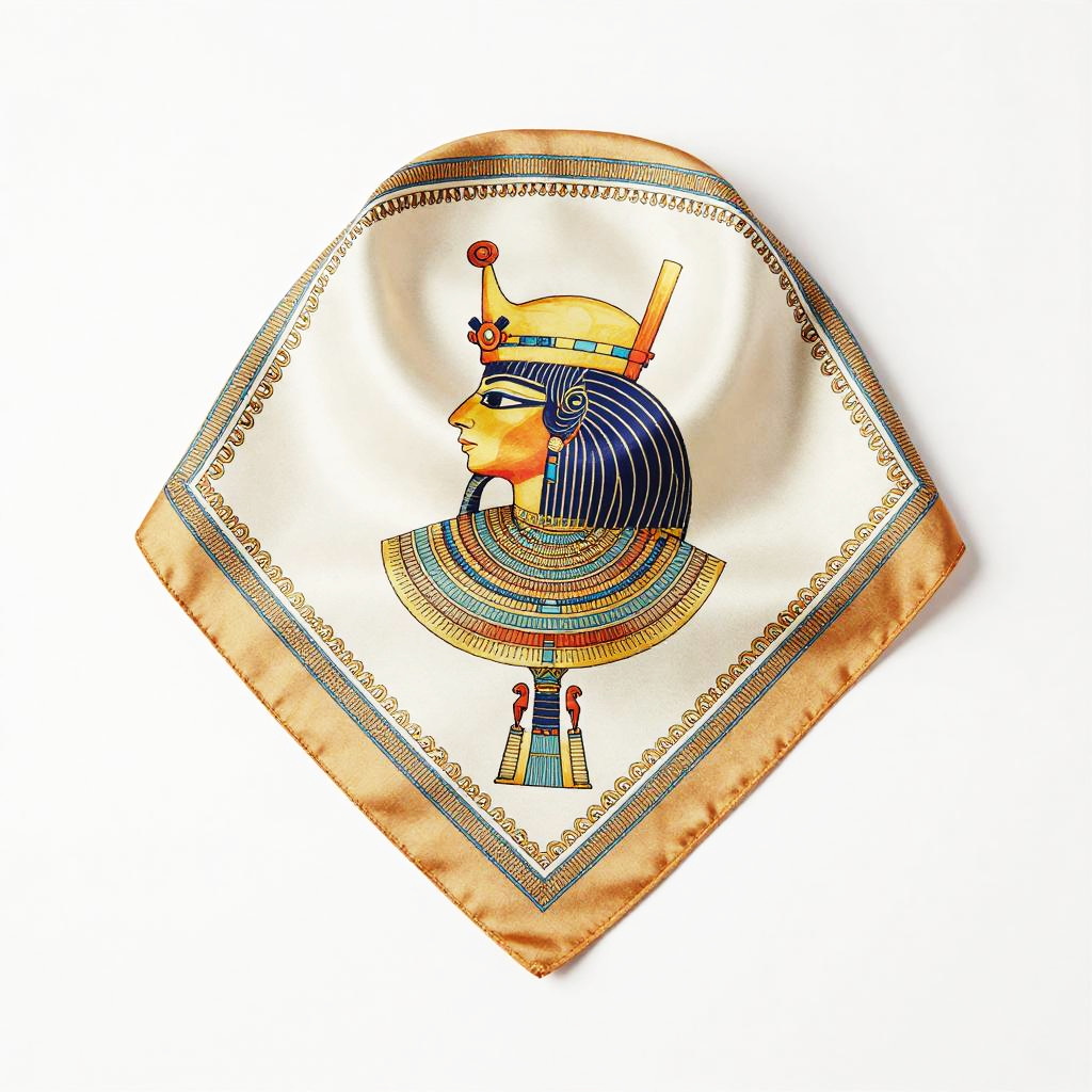 Dorothea Lange a tasseled silk bandana, featuring ancient Egyptian motifs. The edges of the fabric are outlined by a frame, with intricate details and high-quality illustrations. This design is regal.