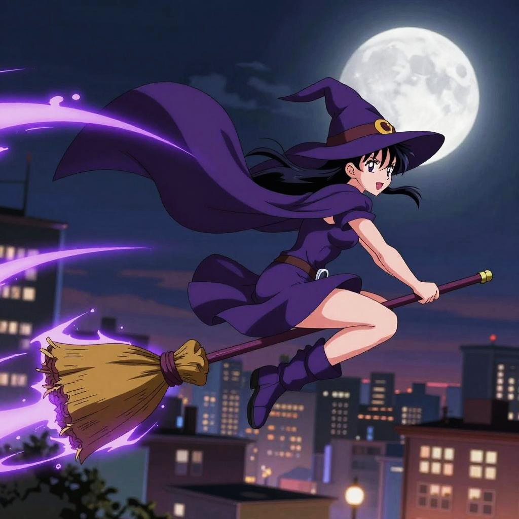 Dynamic purple witch anime character flying on a broomstick over a cityscape at night, her purple cloak billowing in the wind, neon purple magic trails glowing behind her, with a full moon in the background.