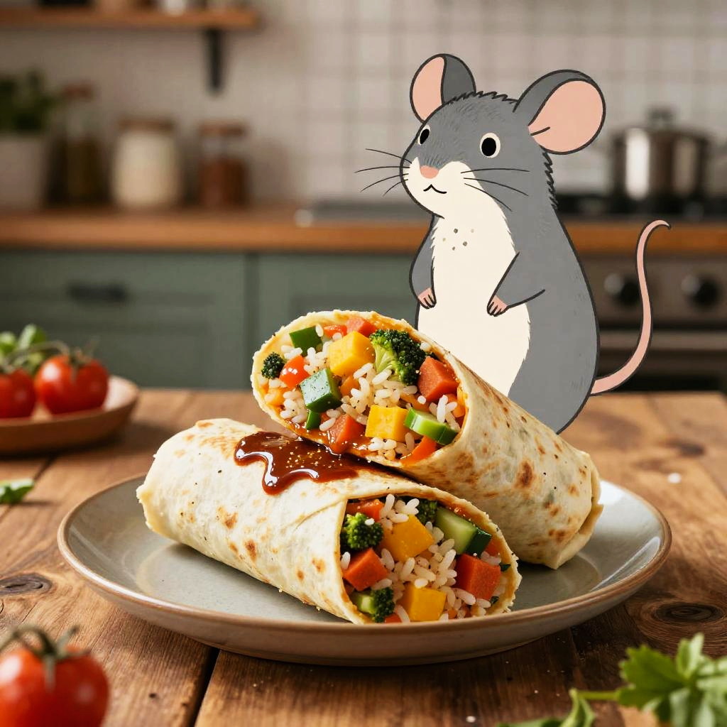 A delicious rat burrito served on a rustic wooden table, the burrito filled with colorful vegetables, rice, and sauce, with a whimsical cartoon rat mascot beside it, vibrant lighting and cozy atmosphere in a rustic kitchen setting.