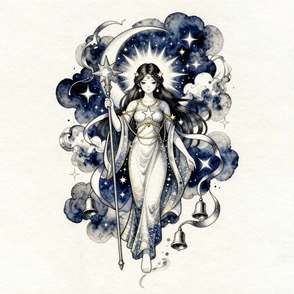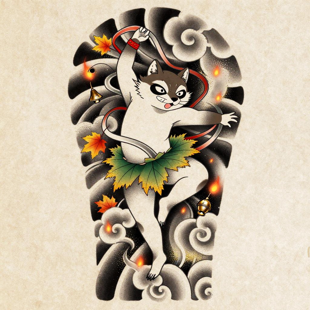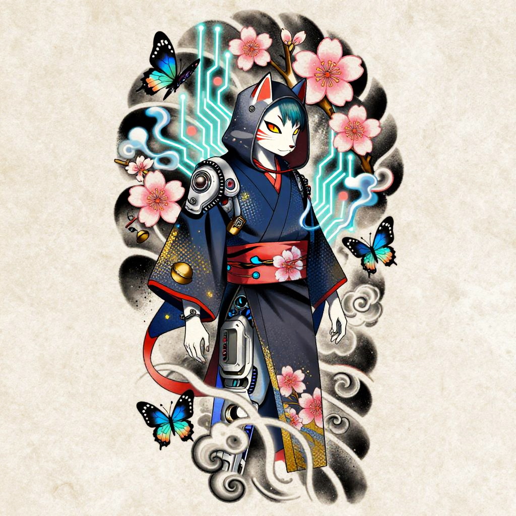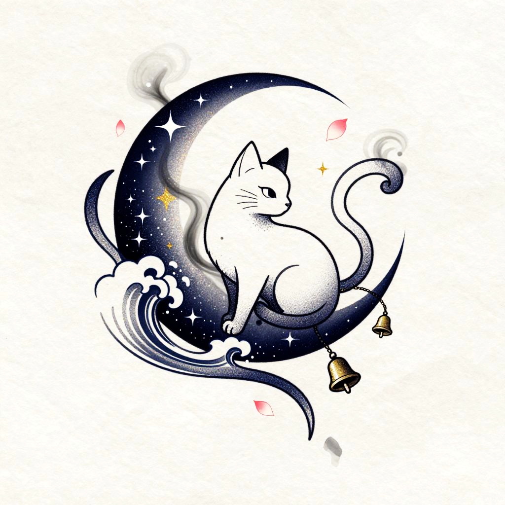 Sleek modern minimalist neo-traditional anime tattoo design of cat spirit curled on swirling crescent moon, entwined with star clusters, minimalist wave forms, drifting sakura petals, subtle smoke trails; bold black outlines, fine dotwork and sumi-e washes, subtle watercolor bleeds, iridescent gradients and gold accents, deep indigo shadows, negative space clouds, balanced asymmetry and sweeping motion, ribbons and bells in motion, tranquil yet dramatic mood, high-detail linework, needle-aware detail density for clean healing, flash sheet styling, parchment paper texture, crisp edges, elegant composition.