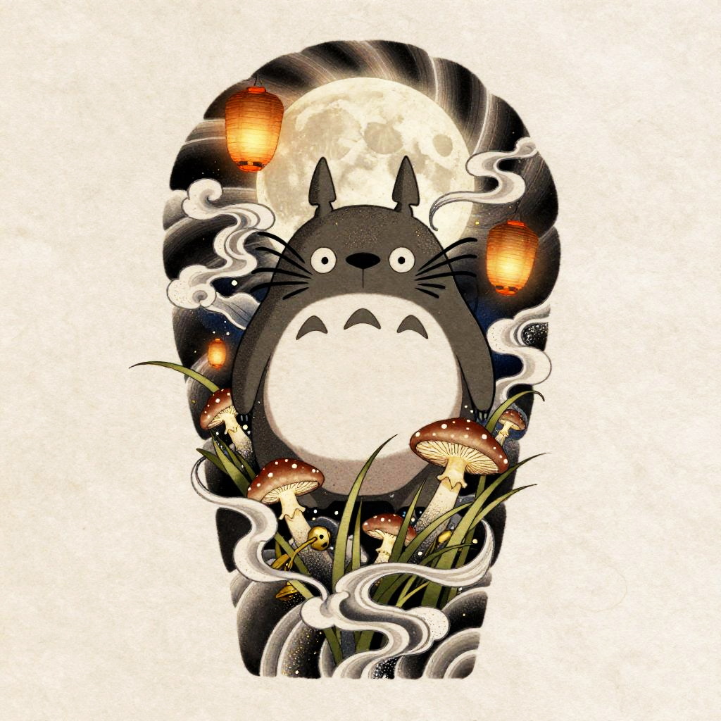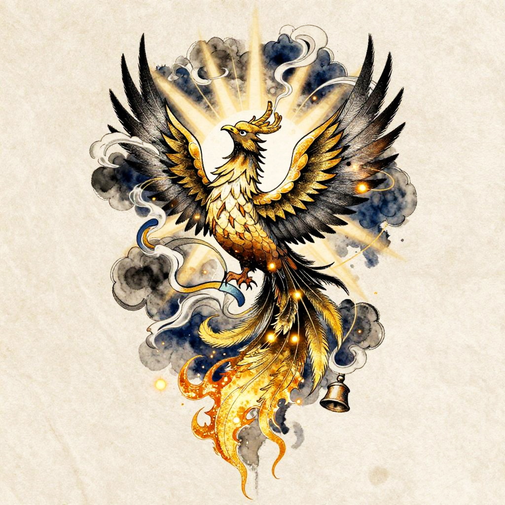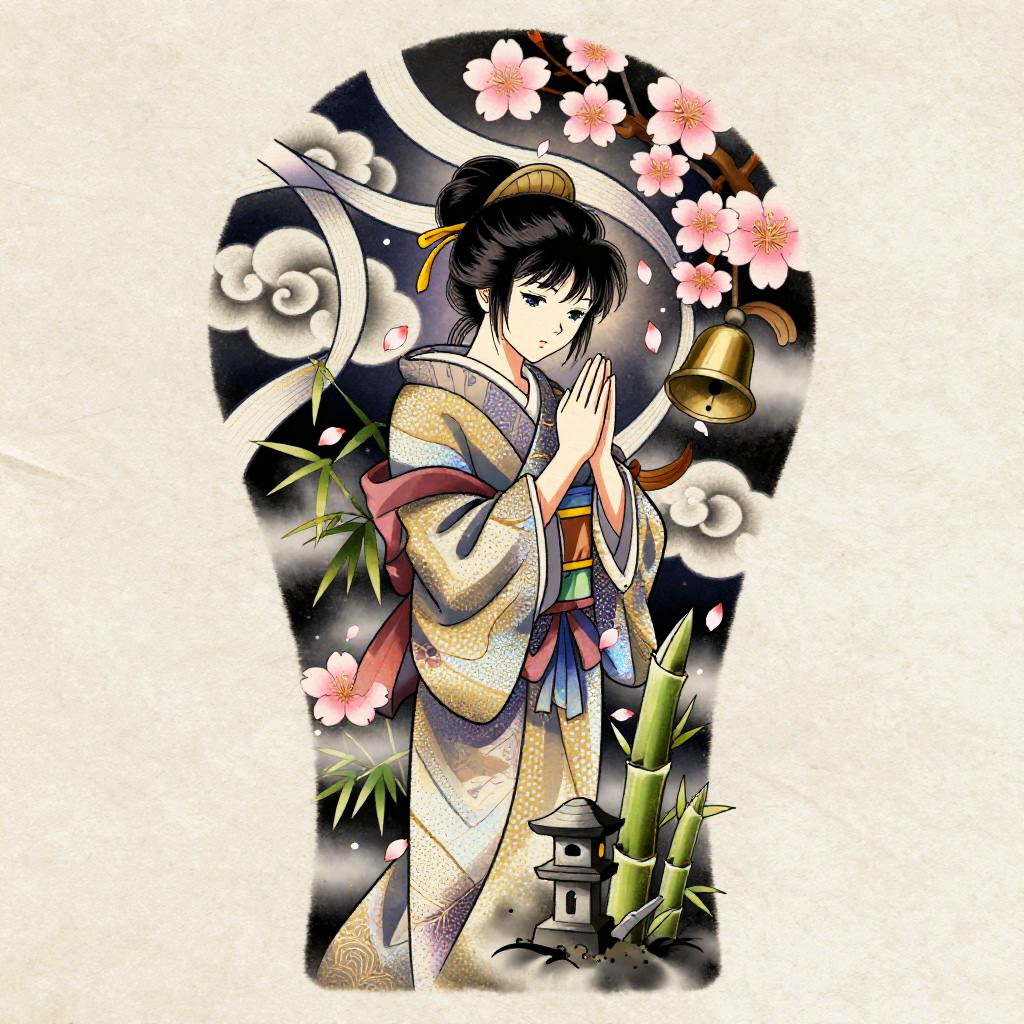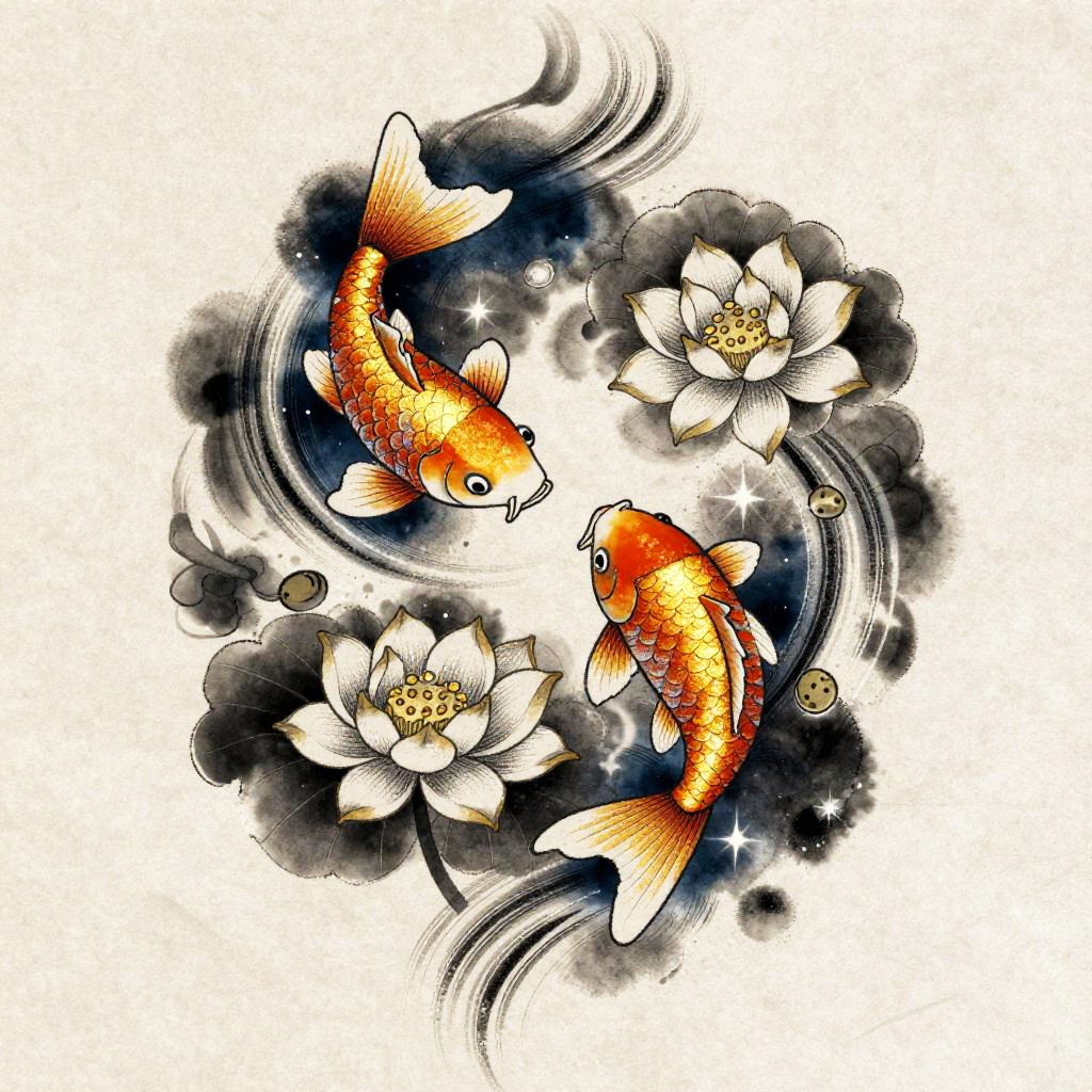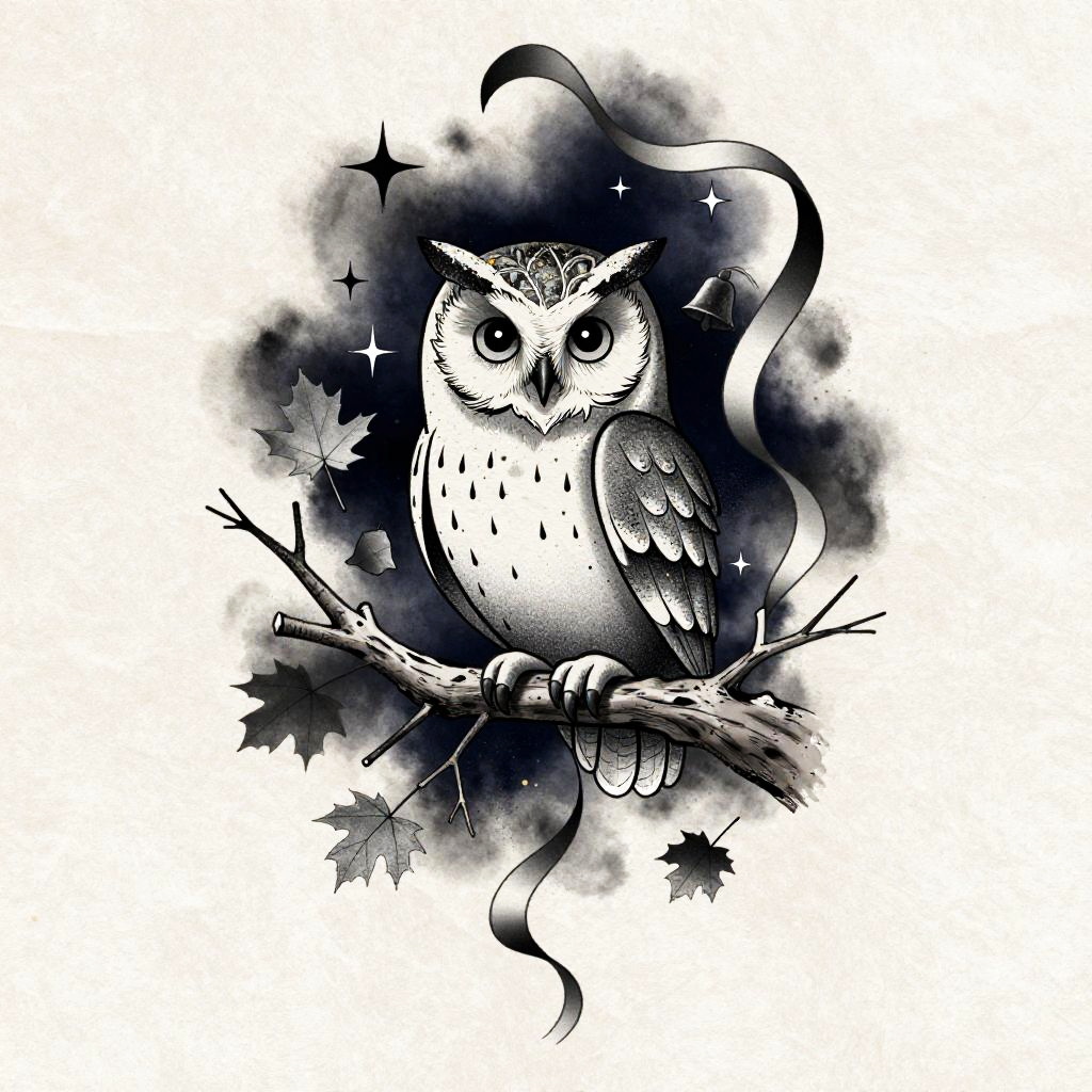 Sleek modern minimalist neo-traditional anime tattoo design of cat spirit curled on swirling crescent moon, entwined with star clusters, minimalist wave forms, drifting sakura petals, subtle smoke trails; bold black outlines, fine dotwork and sumi-e washes, subtle watercolor bleeds, iridescent gradients and gold accents, deep indigo shadows, negative space clouds, balanced asymmetry and sweeping motion, ribbons and bells in motion, tranquil yet dramatic mood, high-detail linework, needle-aware detail density for clean healing, flash sheet styling, parchment paper texture, crisp edges, elegant composition.