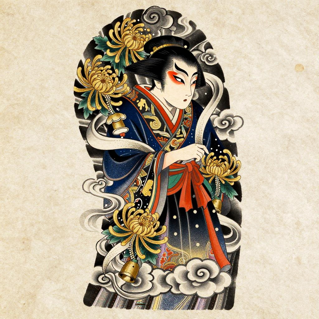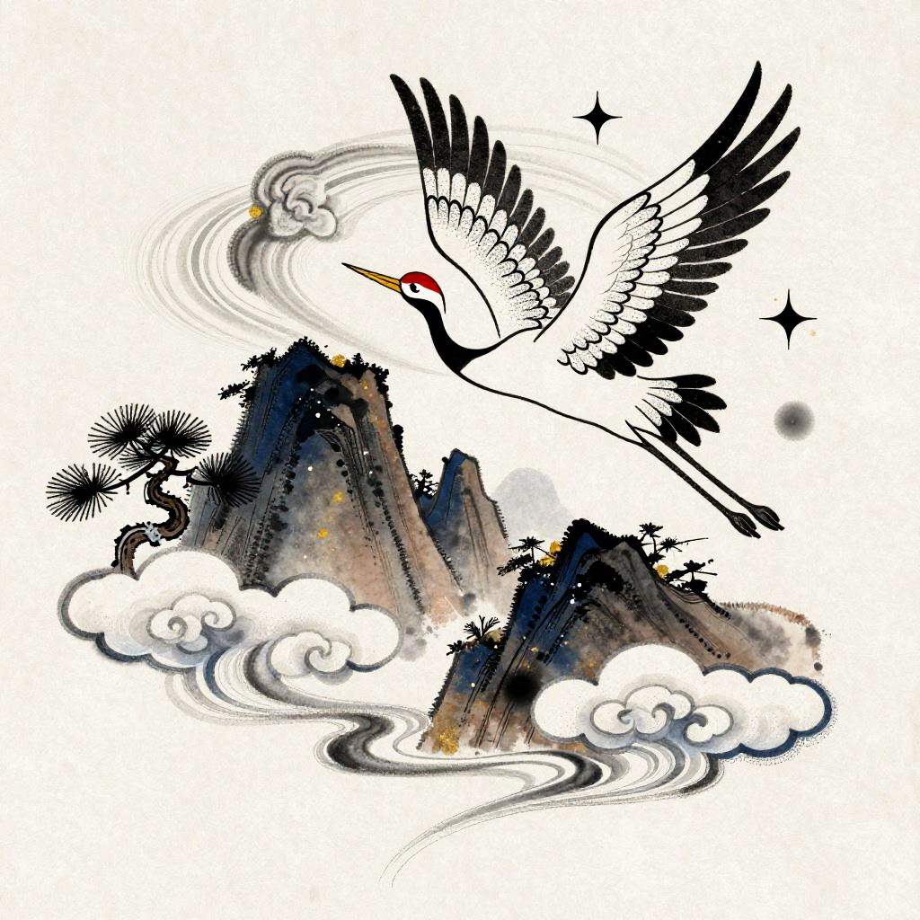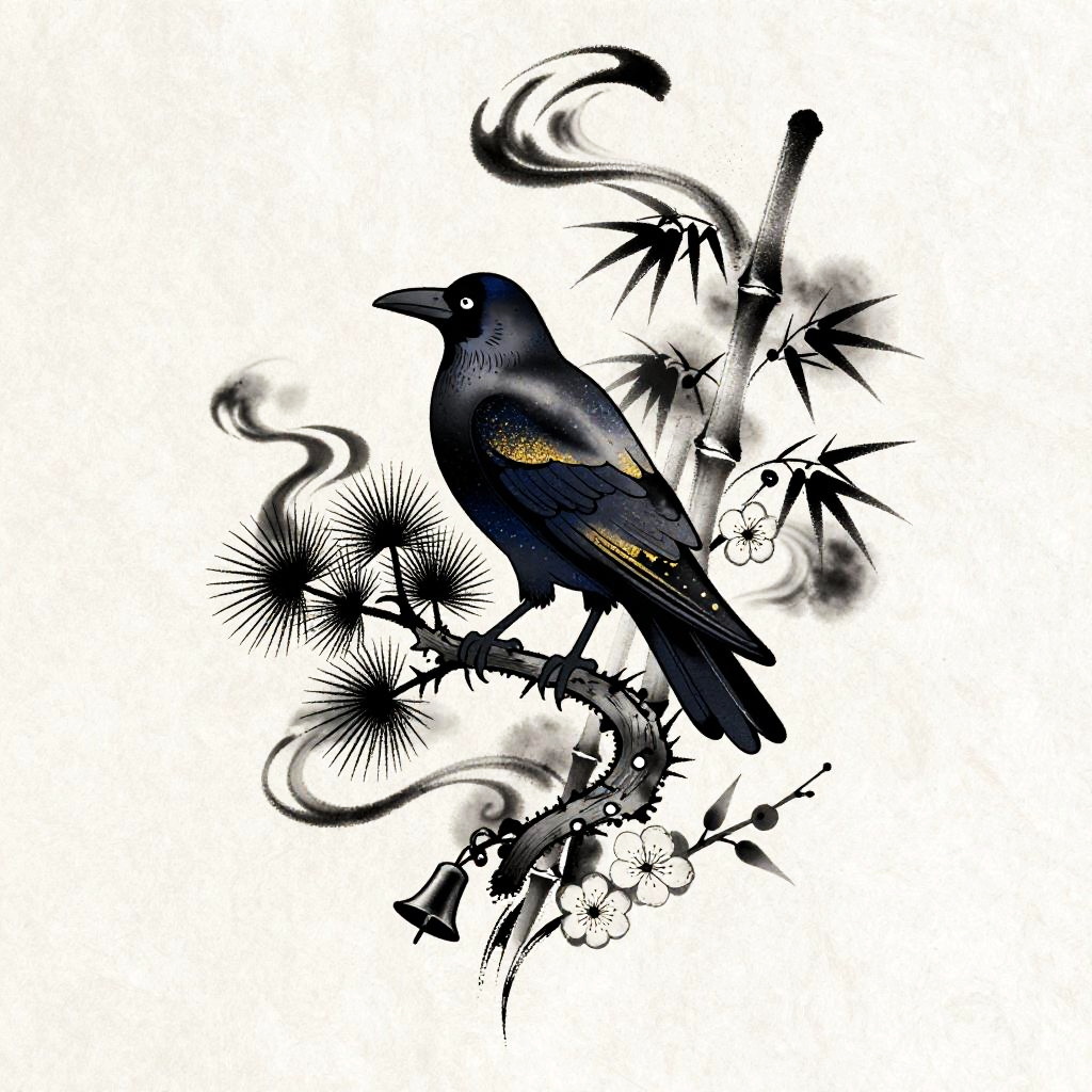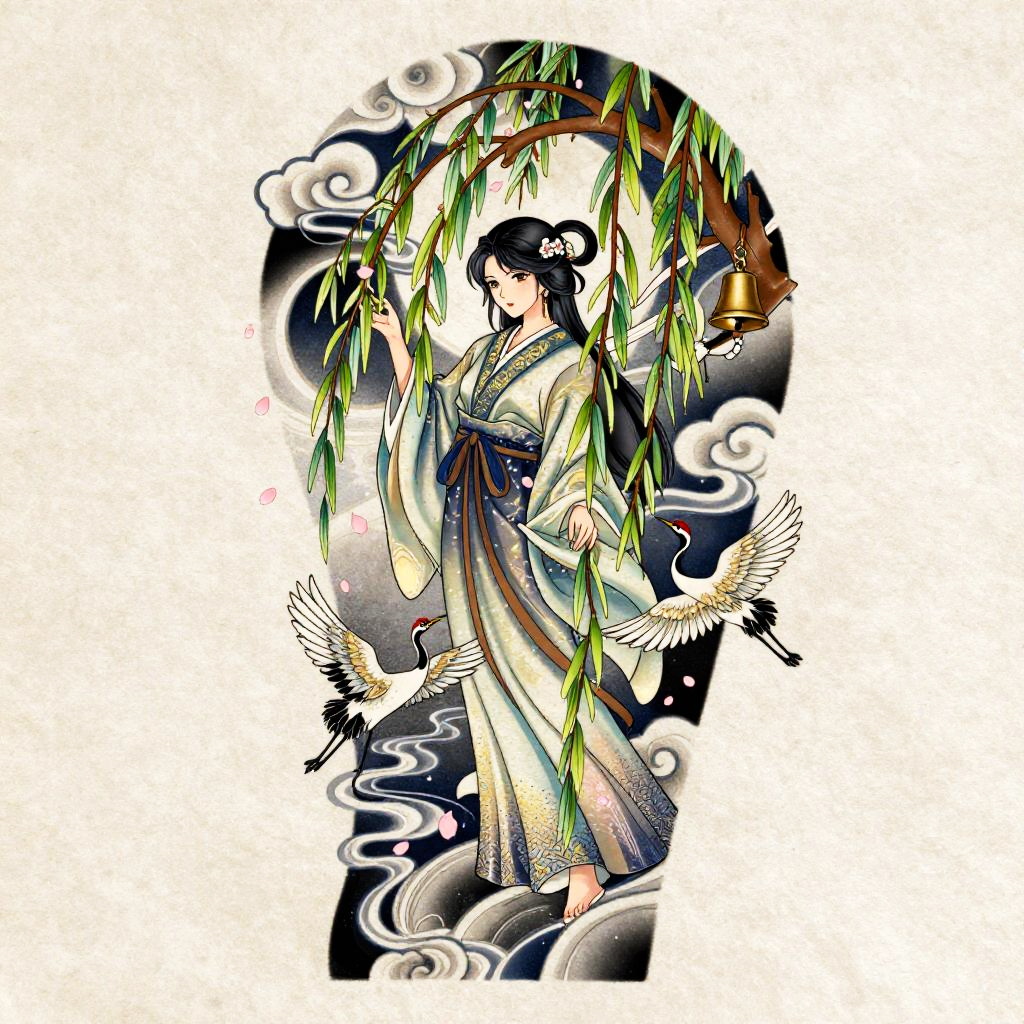 Sleek modern minimalist neo-traditional anime tattoo design of cat spirit curled on swirling crescent moon, entwined with star clusters, minimalist wave forms, drifting sakura petals, subtle smoke trails; bold black outlines, fine dotwork and sumi-e washes, subtle watercolor bleeds, iridescent gradients and gold accents, deep indigo shadows, negative space clouds, balanced asymmetry and sweeping motion, ribbons and bells in motion, tranquil yet dramatic mood, high-detail linework, needle-aware detail density for clean healing, flash sheet styling, parchment paper texture, crisp edges, elegant composition.