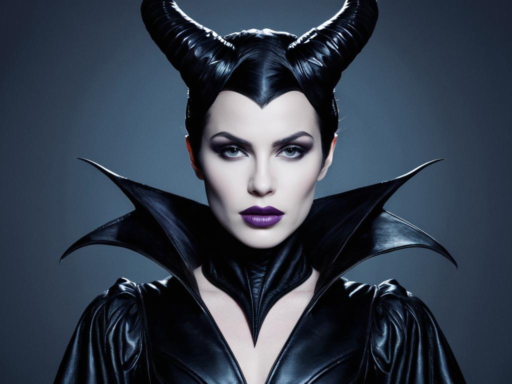 Maleficent Adult Fancy Dress face swap, maleficent in black leather with horns and purple lips