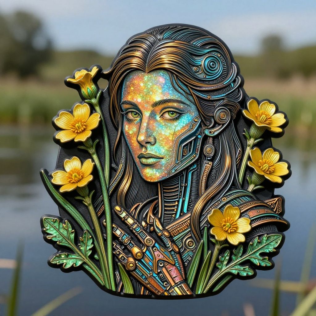 This is a digital drawing in a vibrant, surreal style. The image features a detailed, stylized portrait of a woman with an intricate, metallic, and futuristic appearance. Her face is adorned with glowing, multicolored patterns in shades of blue, yellow, and green, giving a cosmic effect. She has long, flowing hair with swirling patterns and wears a high-collared, ornate garment with various textures and metallic elements. Surrounding her head are four bright yellow flowers with green leaves, adding a natural contrast to the futuristic elements. The background is a softly blurred outdoor scene with a body of water and greenery, enhancing the surreal quality of the portrait.