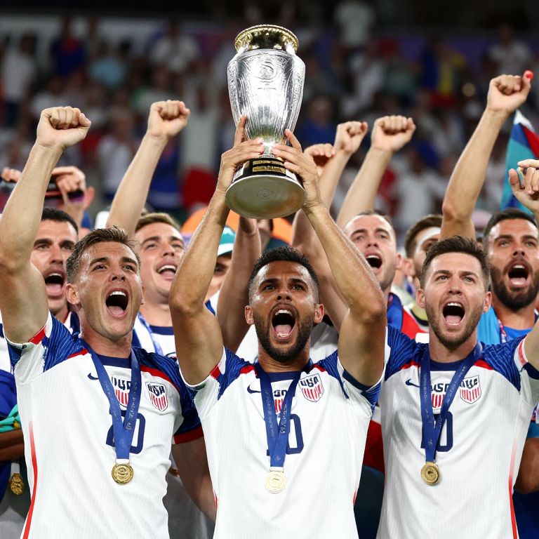 USA soccer team celebrating with a trophy in front of a jubilant crowd.